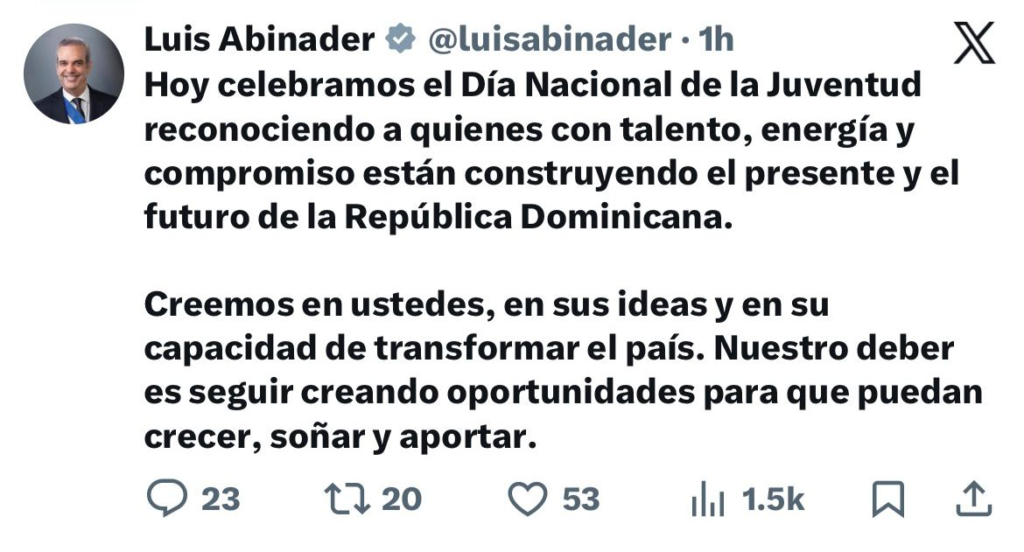 Hoy celebramos el Día Nacional de la Juventud reconociendo a quienes con talento, energía y compromiso están construyendo el presente y el futuro de la República Dominicana”, expresó a través de su red social X.