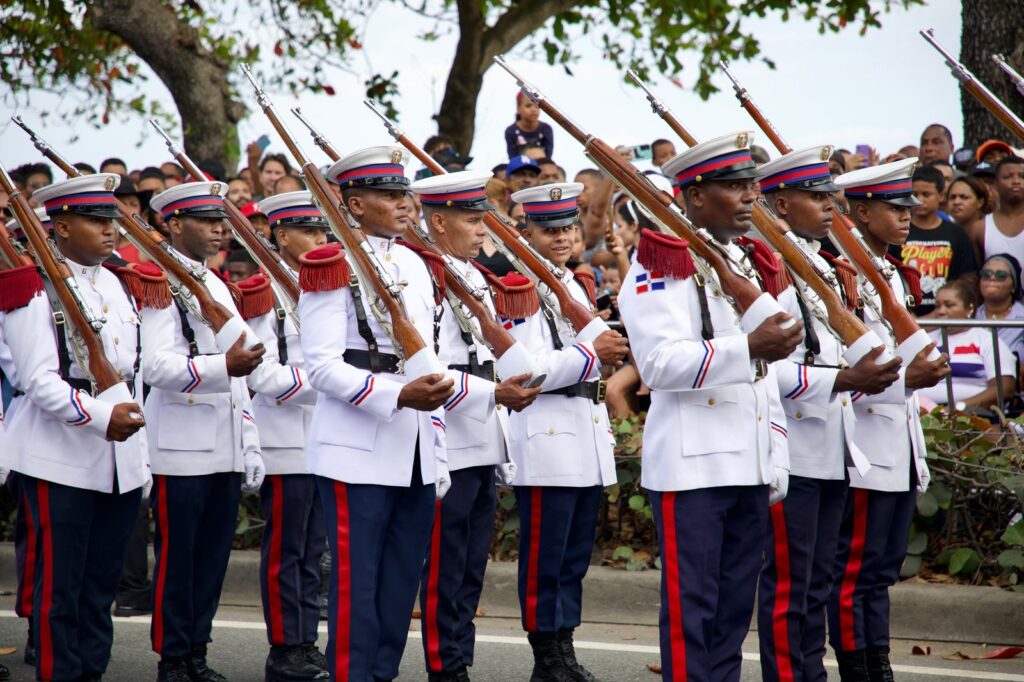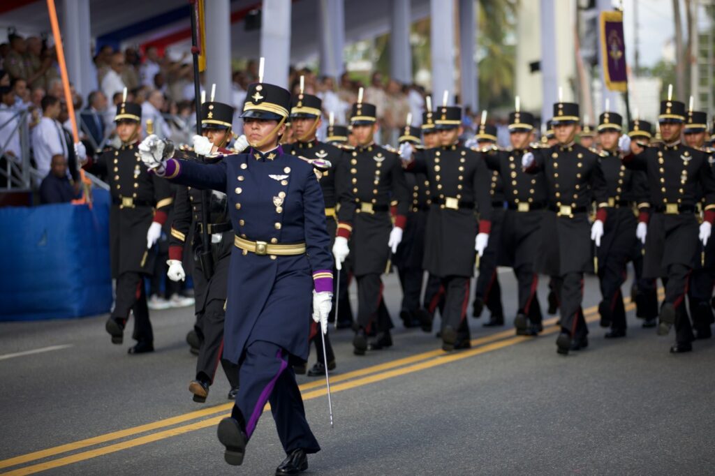 Flanqueados por la Banda de Música, hicieron entrada los miembros del Ejército de República Dominicana encabezados por los cadetes de la Academia Militar Batallas de las Carreras, cuyo Batallón de Armas mostró sus habilidades al mandatario con su lema: «Todos somos uno».