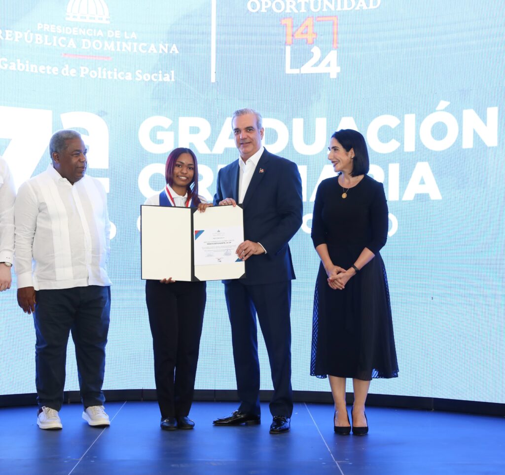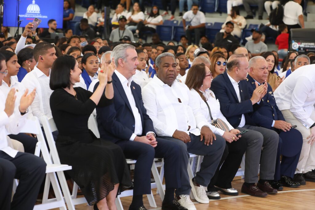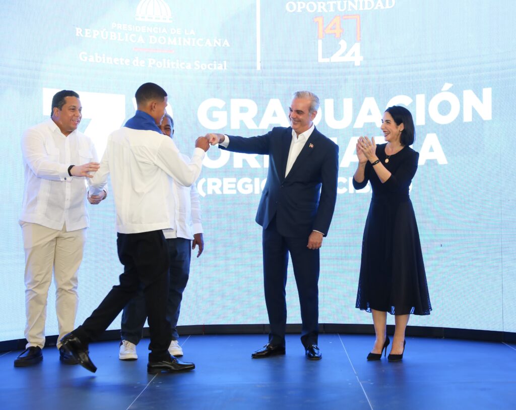 SANTIAGO DE LOS CABALLEROS.- En su compromiso de continuar impulsando la capacitación de la juventud en situación de vulnerabilidad, el presidente Luis Abinader, acompañado de la primera dama Raquel Arbaje, encabezó la séptima graduación ordinaria del programa «Oportunidad 14-24» en la región del Cibao, donde más de 1,300 jóvenes se formaron en diferentes áreas.