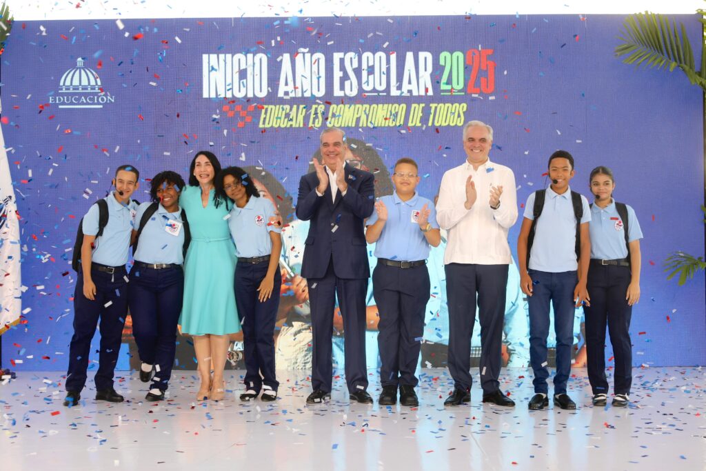 Durante su discurso, el presidente Luis Abinader, acompañado de la primera dama, Raquel Arbaje, transmitió un mensaje de esperanza y compromiso al dar inicio al año escolar 2025-2026 e hizo un llamado a los padres para que acompañen y motiven a sus hijos en este nuevo ciclo escolar.