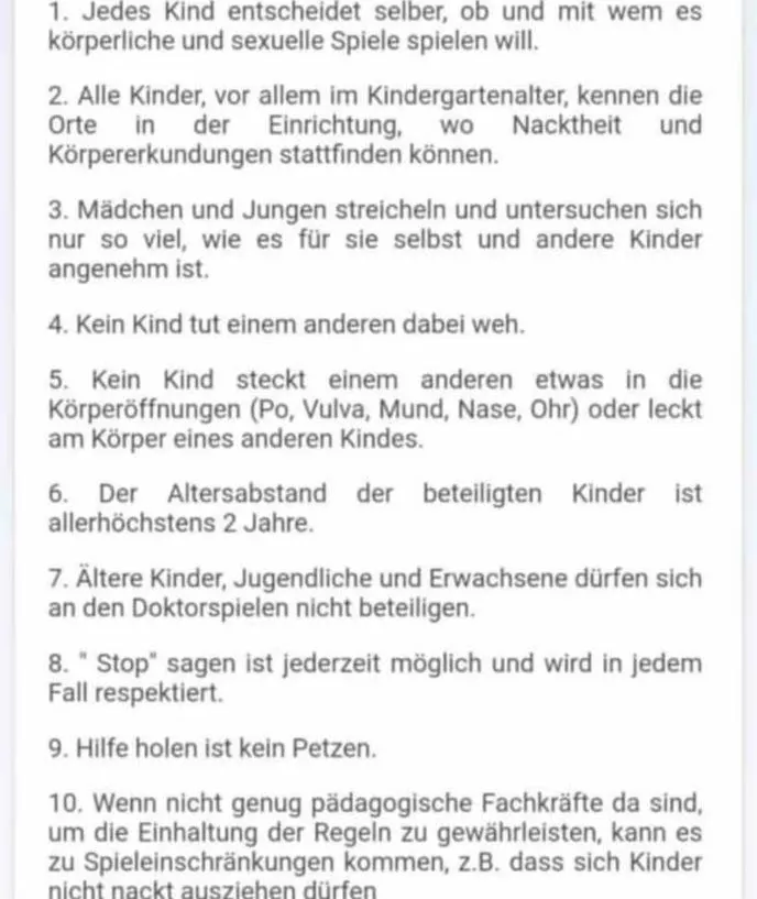 «Todos los niños, especialmente los preescolares, conocen los lugares del centro donde se puede realizar desnudez y exploración corporal. Cada niño decide por sí mismo si quiere jugar juegos físicos y sexuales y con quién. Las niñas y los niños se acarician y se examinan unos a otros. sólo en la medida en que les resulte cómodo a ellos y a otros niños», decía en parte la guía.