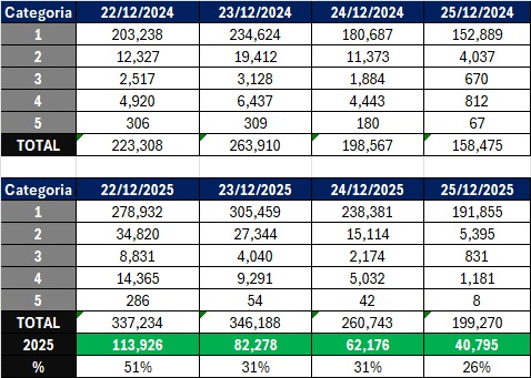Las cifras oficiales muestran que en el mismo intervalo de diciembre de 2023 se movilizaron 1,581,610 vehículos, mientras que en 2024 la cantidad fue de 1,913,921. Esto refleja un crecimiento aproximado del 24 % en 2025, según una nota de la Presidencia de la República.