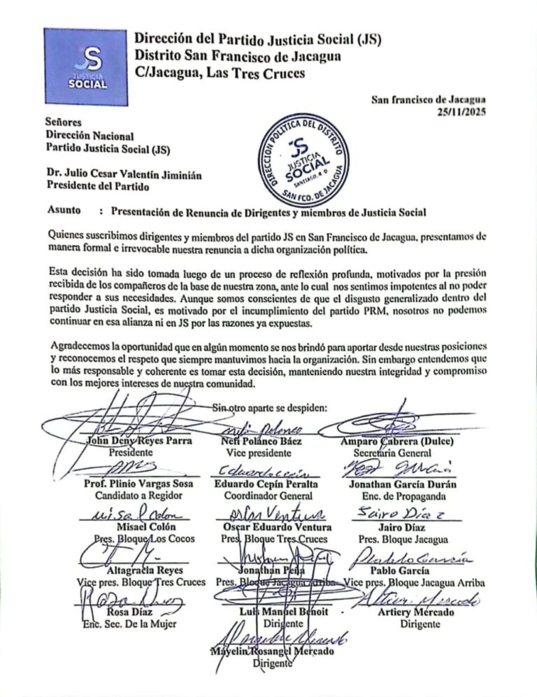 Más de 15 dirigentes del Partido Justicia Social (JS) en San Francisco de Jacagua presentaron este martes su renuncia formal e irrevocable, según consta en un documento dirigido al presidente de la organización, Julio César Valentín Jiminián.