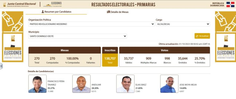 Francisco Peña Tavárez emergió como el vencedor en las elecciones primarias del Partido Revolucionario Moderno (PRM) que tuvieron lugar el domingo 1 de octubre, obteniendo un 35.27% de los votos en 270 mesas computadas.»