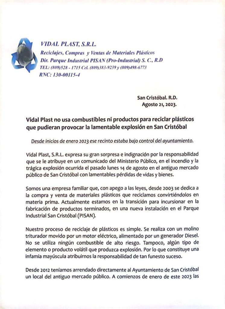 La recicladora de plástico que ha sido citada como posible responsable de la explosión en San Cristóbal afirma que en el local que ocupaba no había equipos, materiales o combustibles que pudieran originar ese trágico hecho y que prueba de esto es que el cadáver del único empleado presente fue encontrado íntegro y que el certificado de defunción dice su muerte fue causada por «asfixia por inhalación de humo».