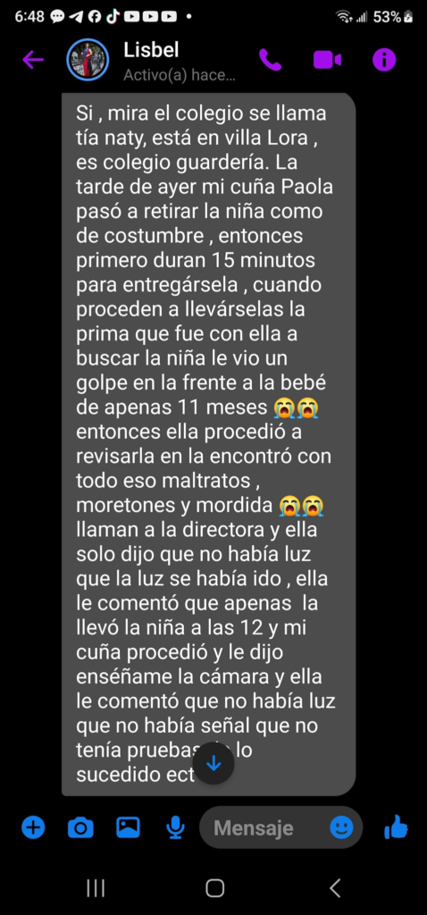 La señora Tejada Méndez asegura que al buscar su hija las cuidadoras no dieron ninguna explicación sobre lo ocurrido y, por si fuera poco, se negaron a mostrar las grabaciones de las cámaras de seguridad, alegando que no había electricidad y por tanto no había señal.