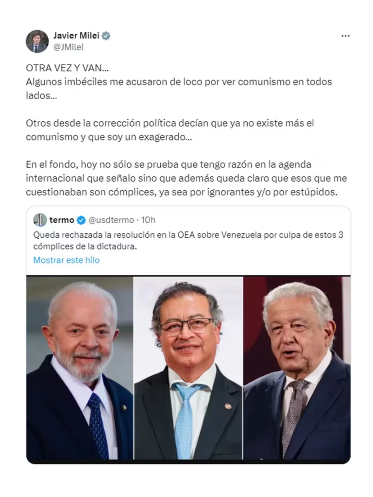 El presidente de Argentina Javier Milei se refirió a los presidentes Lula Da Silva (Brasil), Gustavo Petro (Colombia) y Andrés Manuel López Obrador (México) por la abstención de sus países a votar por la resolución de la Organización de Estados Americanos (OEA) que buscaba condenar el fraude electoral en Venezuela.