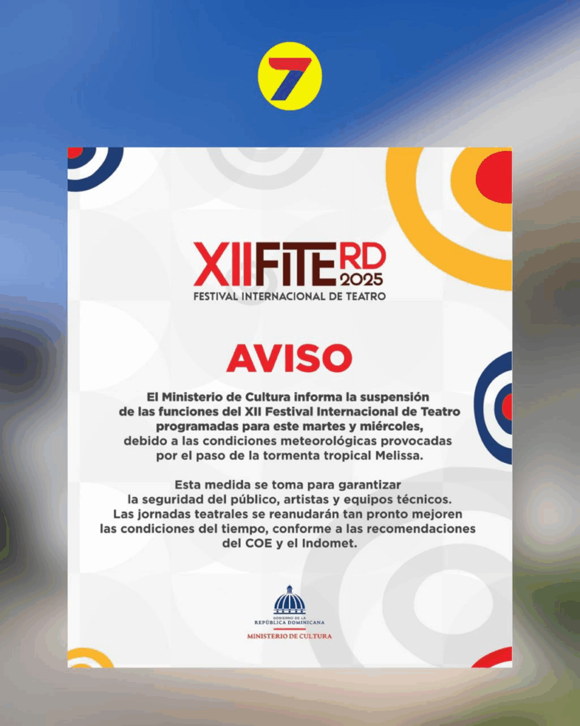 Santo Domingo. – El Ministerio de Cultura anunció la suspensión temporal de las funciones programadas para el día de ayer martes 22 y miércoles 23 de octubre del XII Festival Internacional de Teatro República Dominicana (FITE RD 2025), como medida preventiva ante las condiciones meteorológicas provocadas por la tormenta tropical Melissa.