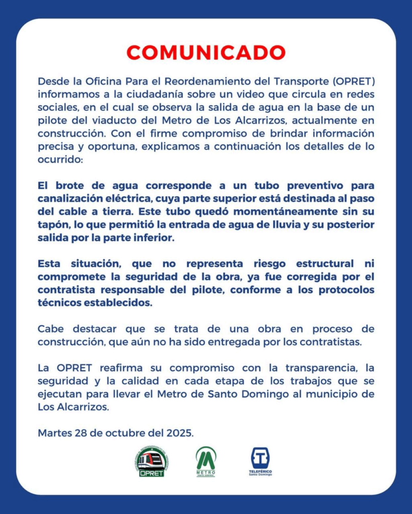 La Oficina para el reordenamiento del transporte (OPRET), emitió un comunicado oficial, asegurando que «no hay riesgo» en el brote de agua que emana de una de las columnas en la construcción del Metro de Los Alcarrizos.