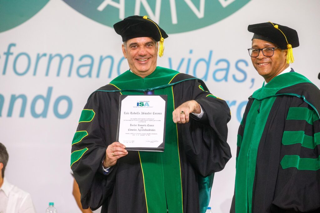 Santiago. – El presidente Luis Abinader recibió este sábado el título “Doctor Honoris Causa” en Ciencias Agroindustriales, la más alta distinción, otorgada por la Universidad ISA, en reconocimiento de su liderazgo visionario y las iniciativas impulsadas para fortalecer los programas educativos y el sector agroindustrial y productivo del país.