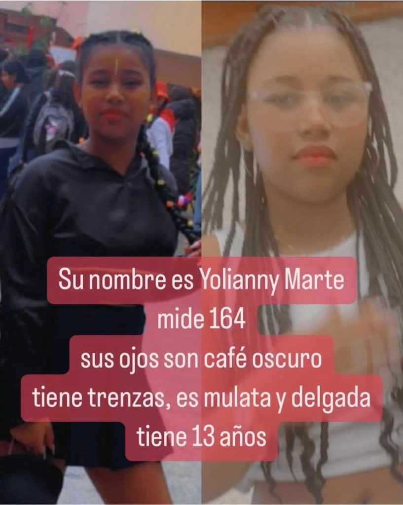 La familia de Yolianny Marte, una adolescente de 13 años de nacionalidad dominicana, la ha reportado como desaparecida en Chile y está solicitando ayuda para localizarla. La joven es descrita como alguien con ojos color café oscuro y que llevaba trenzas en el momento de su desaparición.