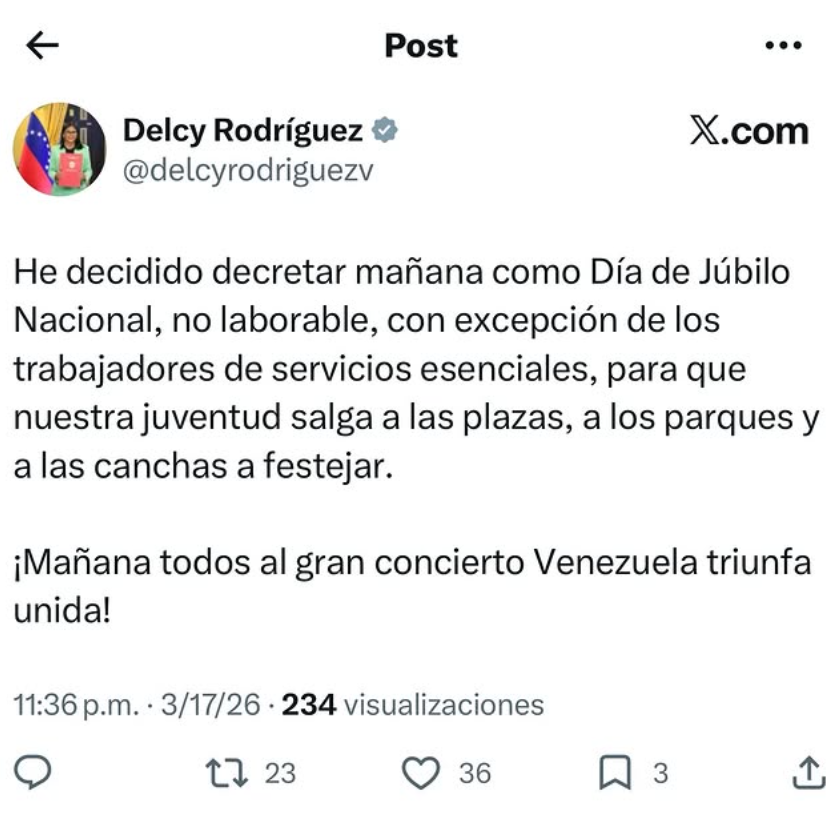 Asimismo, Delcy Rodríguez, presidente interino de Venezuela, declaró para este miércoles 18 de marzo como «Día de Júbilo Nacional» y no laborable para conmemorar el campeonato, destacando el impacto emocional y el orgullo que este triunfo representa para la nación. Más allá del deporte, este título simboliza la unidad y la esperanza de un país que ahora celebra ser campeón del mundo en béisbol por primera vez.
