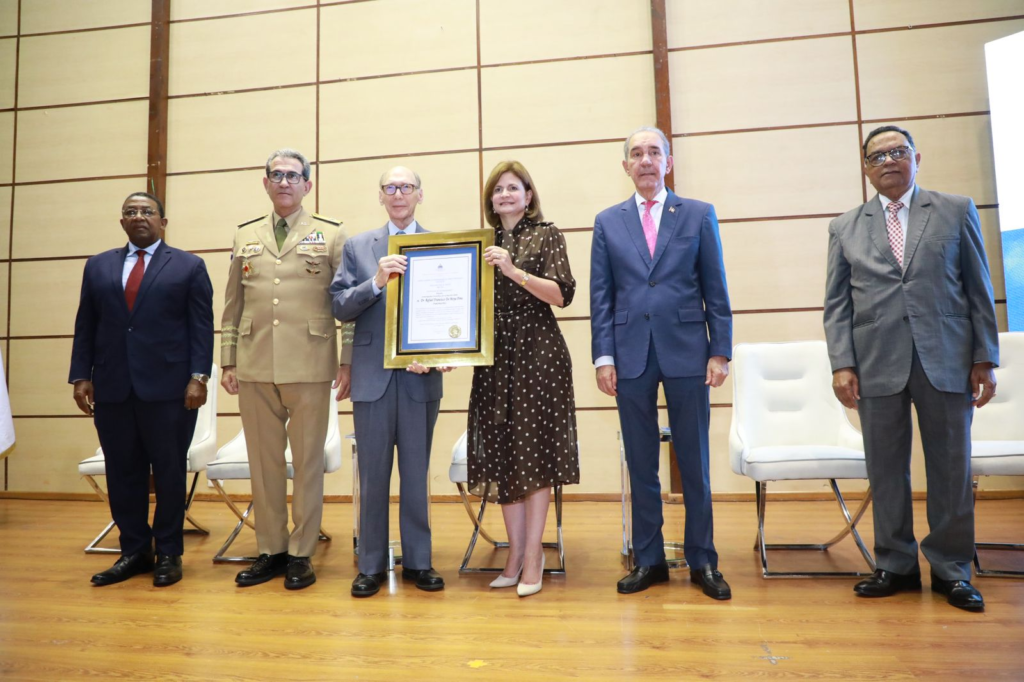 Peña destacó la extraordinaria trayectoria en el ámbito científico del historiador Frank Moya Pons a quien le fue entregado el máximo galardón de “Investigador de la Nación” y señaló que es un testimonio del poder del intelecto y del compromiso inquebrantable con la verdad y el progreso.