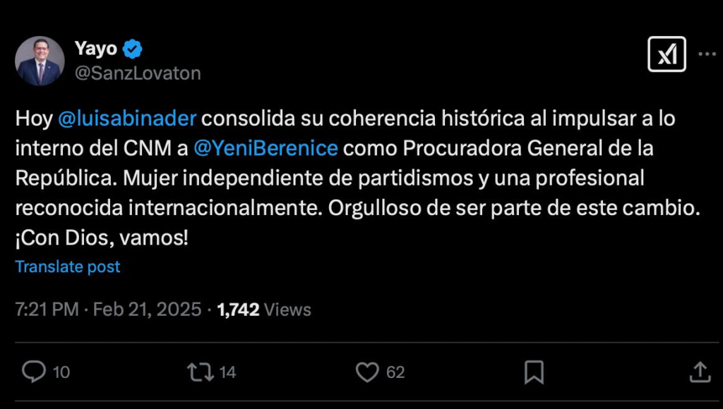 A través de su cuenta de X, el religioso publicó que la colocación de Reynoso es un reconocimiento a los casi 30 años en la mejora del sistema de justicia de la República Dominicana.